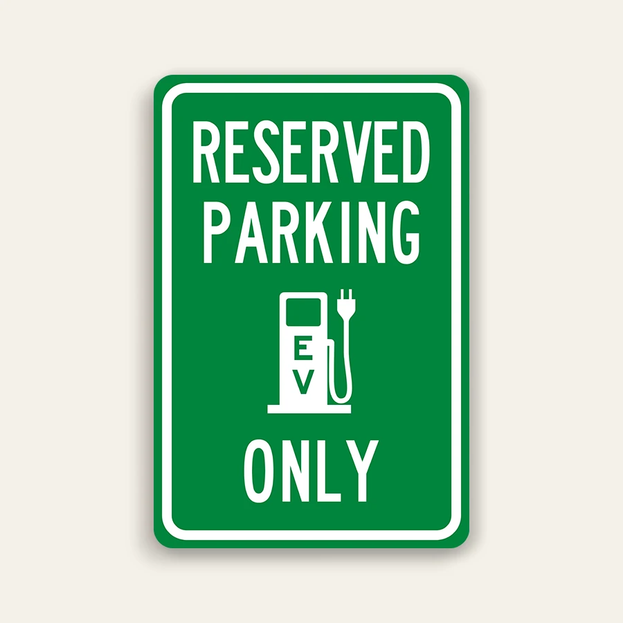 Reserved Parking – EV Charging Only Sign with Plug Icon 12×18 Inch This green sign reserves parking spaces exclusively for electric vehicle (EV) charging, featuring a clear EV pump icon (gas pump with plug and “EV” label) to visually communicate the purpose. It includes bold white text “RESERVED PARKING” at the top and “ONLY” at the bottom for maximum clarity and enforcement.