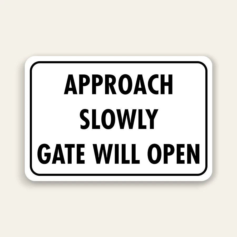 This clear instructional sign advises drivers to approach the gate slowly because it will open automatically, promoting safe and controlled entry to prevent collisions with the opening gate.