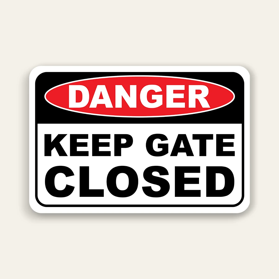 This high-impact danger sign emphatically requires the gate to remain closed at all times, using a red “DANGER” header to signal serious hazards like security risks or pinch points.