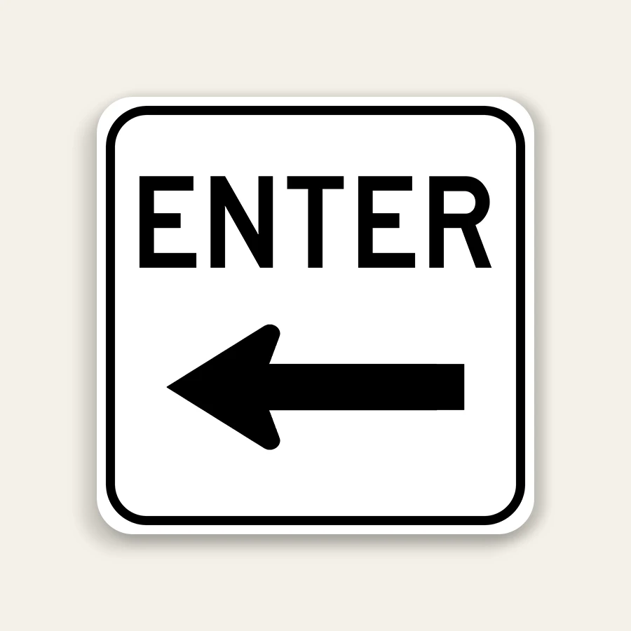 This directional sign guides vehicles to enter from the right side (or follow a leftward path) into parking lots, drive-thrus, loading areas, private roads, or restricted zones. It features a white background with black border, bold black text “ENTER” at the top, and a prominent black left arrow below for clear, unambiguous direction even at a glance.