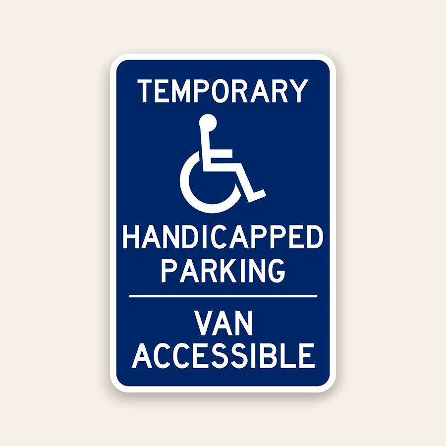 This ADA-compliant sign clearly identifies a temporary handicap parking space with van accessibility. Featuring the universal wheelchair symbol and bold “Temporary” designation, it ensures drivers understand that the space is reserved for accessible use on a temporary basis.
