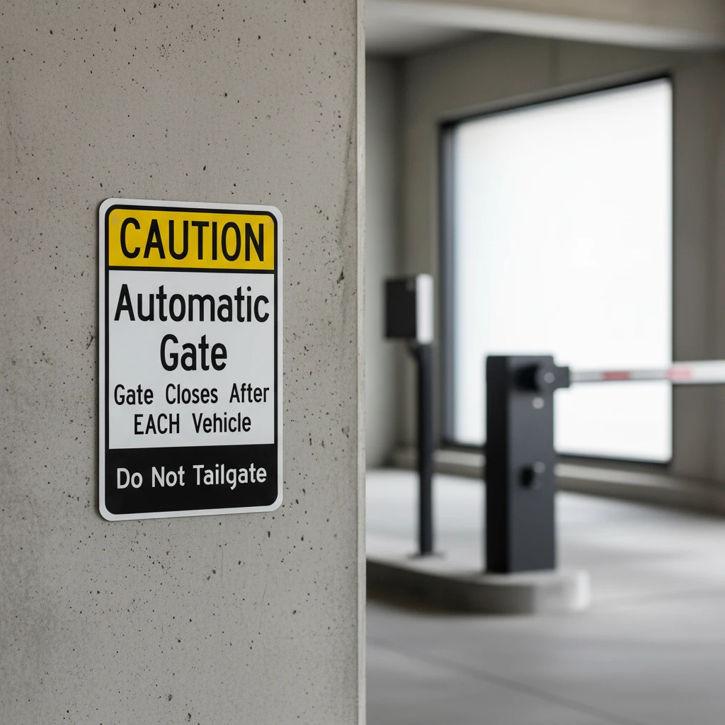 Warns drivers not to tailgate and alerts that the gate closes after each vehicle. Ideal for gated communities, parking facilities, and controlled access properties across Los Angeles. Improves traffic flow and safety.