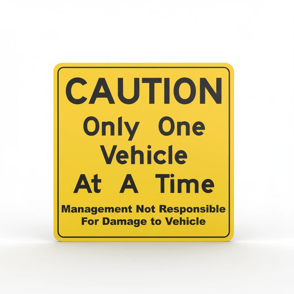 Informs drivers that only one vehicle is allowed at a time and includes a liability notice. Ideal for gated communities, parking facilities, and commercial properties across Los Angeles. Helps prevent accidents and misuse.