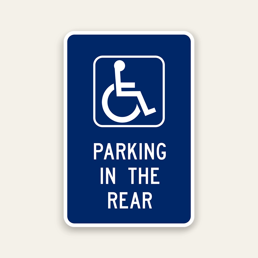 Handicap parking in the rear sign with ADA symbol directing drivers to rear parking area